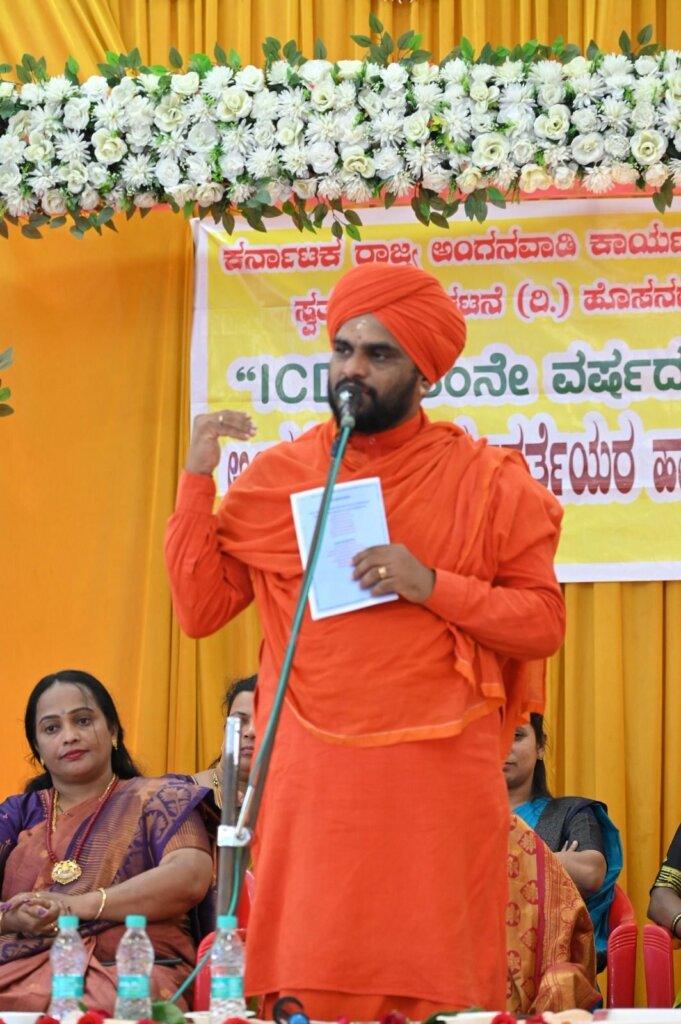 ಕಾರ್ಯಕ್ರಮದ ದಿವ್ಯ ಸಾನಿಧ್ಯ ವಹಿಸಿ ಆಶೀರ್ವಚನ ನೀಡಿದ ಮೂಲೆಗದ್ದೆ ಮಠದ ಶ್ರೀ ಅಭಿನವ ಚನ್ನಬಸವ ಮಹಾಸ್ವಾಮಿಗಳು, “ಮಕ್ಕಳಿಗೆ ತಾಯಿಯಾಗಿ ಸಂಸ್ಕಾರ ಮತ್ತು ನೈತಿಕ ಮೌಲ್ಯಗಳನ್ನು ಕಲಿಸುವ ‘ಅಮ್ಮ’ ಎಂದರೆ ಅದು ಅಂಗನವಾಡಿ ಕಾರ್ಯಕರ್ತೆಯರು. ಇವರು ಮಾಡಬಲ್ಲ ಕೆಲಸವನ್ನು ದೊಡ್ಡ ದೊಡ್ಡ ಅಧಿಕಾರಿಗಳಿಂದಲೂ ಮಾಡಲು ಸಾಧ್ಯವಿಲ್ಲ. ಇವರ ಪ್ರಾಮಾಣಿಕ ಸೇವೆ ಇಡೀ ವಿಶ್ವಕ್ಕೆ ಮಾದರಿಯಾಗಿದೆ. ಇವರ ನ್ಯಾಯಯುತ ಹೋರಾಟಕ್ಕೆ ನನ್ನ ಸಂಪೂರ್ಣ ಬೆಂಬಲವಿದೆ” ಎಂದು ಹಾರೈಸಿದರು.