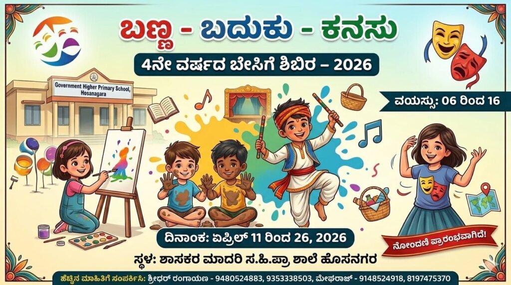 ಹೊಸನಗರ: ಈ ಬೇಸಿಗೆ ರಜೆಯಲ್ಲಿ ನಿಮ್ಮ ಮಕ್ಕಳು ಕೇವಲ ಮೊಬೈಲ್ ಅಥವಾ ಟಿವಿಗೆ ಅಂಟಿಕೊಳ್ಳದೆ, ಹೊಸ ಕಲೆಗಳನ್ನು ಕಲಿಯುತ್ತಾ ಸೃಜನಶೀಲರಾಗಲು ಇಲ್ಲಿದೆ ಒಂದು ಅದ್ಭುತ ಮತ್ತು ಸುವರ್ಣ ಅವಕಾಶ. ಪಟ್ಟಣದ ಶಾಸಕರ ಮಾದರಿ ಸರ್ಕಾರಿ ಹಿರಿಯ ಪ್ರಾಥಮಿಕ ಶಾಲೆಯಲ್ಲಿ ಏಪ್ರಿಲ್ 11 ರಿಂದ 26 ರವರೆಗೆ ‘ಬಣ್ಣ-ಬದುಕು-ಕನಸು’ ಎಂಬ ವಿಶಿಷ್ಟ ಬೇಸಿಗೆ ಶಿಬಿರವನ್ನು ಆಯೋಜಿಸಲಾಗಿದೆ.