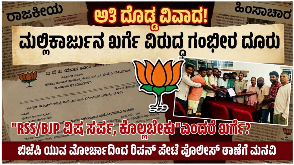 ರಿಪ್ಪನ್ಪೇಟೆ: ಅಸ್ಸಾಂ ವಿಧಾನಸಭಾ ಚುನಾವಣಾ ಪ್ರಚಾರದ ವೇಳೆ ಕಾಂಗ್ರೆಸ್ ರಾಷ್ಟ್ರೀಯ ಅಧ್ಯಕ್ಷ ಮಲ್ಲಿಕಾರ್ಜುನ ಖರ್ಗೆ ಅವರು ನೀಡಿದ್ದಾರೆನ್ನಲಾದ ಪ್ರಚೋದನಾಕಾರಿ ಹೇಳಿಕೆಯನ್ನು ಖಂಡಿಸಿ ಬಿಜೆಪಿ ಯುವ ಮೋರ್ಚಾ ಕೆರೆಹಳ್ಳಿ ಹೋಬಳಿ ಮಹಾಶಕ್ತಿ ಕೇಂದ್ರದ ವತಿಯಿಂದ ರಿಪ್ಪನ್ಪೇಟೆ ಪೊಲೀಸ್ ಠಾಣೆಗೆ ದೂರು ನೀಡಲಾಗಿದೆ.