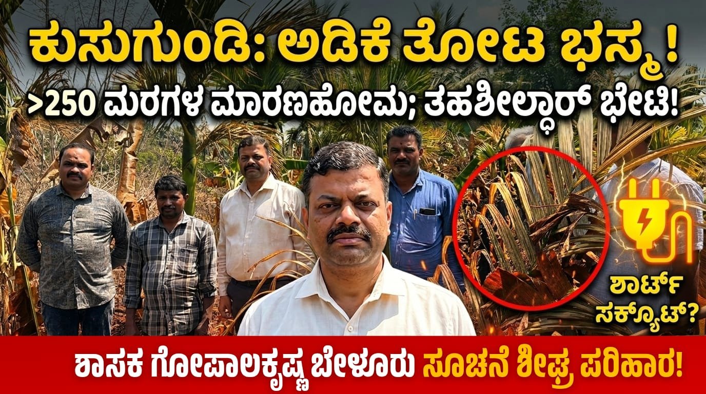 ಕೋಡೂರು: ವಿದ್ಯುತ್ ಶಾರ್ಟ್ ಸರ್ಕ್ಯೂಟ್ನಿಂದ 250ಕ್ಕೂ ಹೆಚ್ಚು ಅಡಿಕೆ ಮರಗಳು ಭಸ್ಮ; ಸಂಕಷ್ಟದಲ್ಲಿ ಕುಸುಗುಂಡಿ ರೈತ ಕುಟುಂಬ
