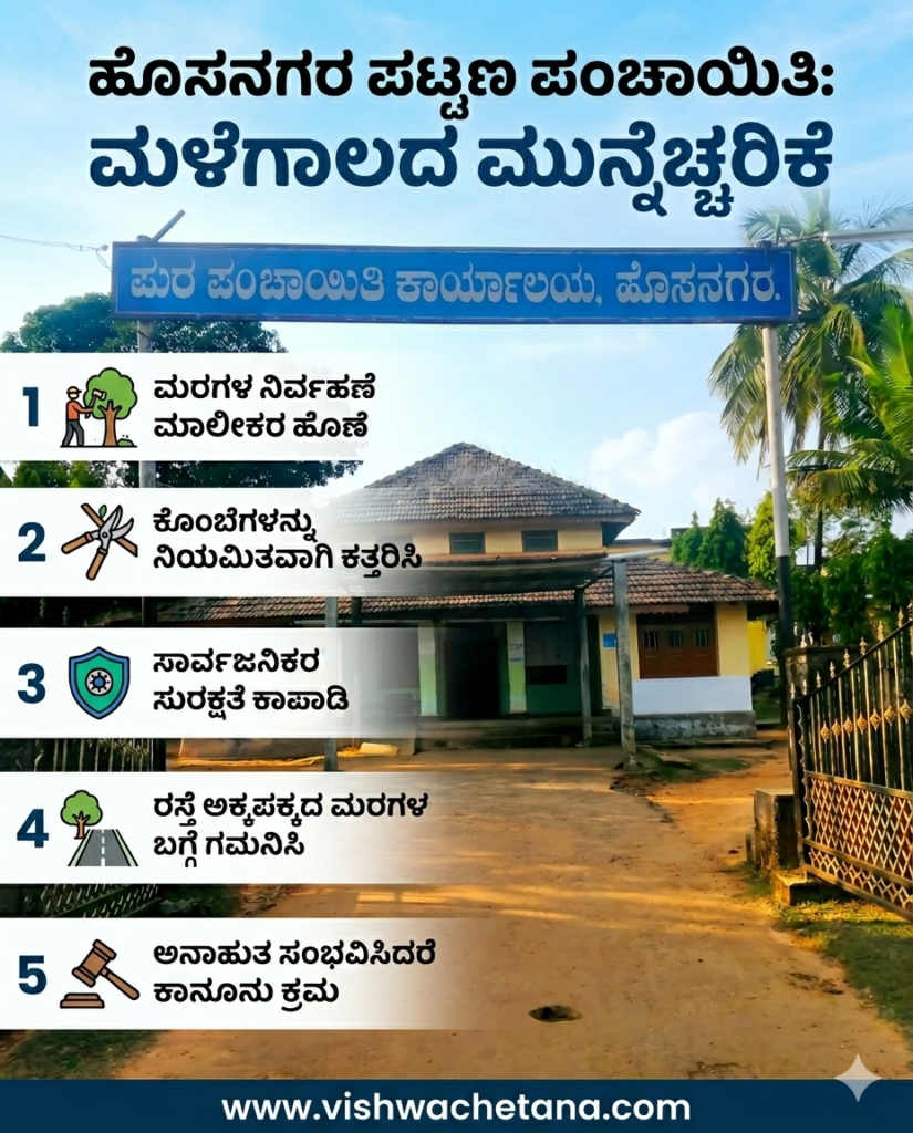 ಮಳೆಗಾಲದ ಅನಾಹುತಗಳನ್ನು ತಡೆಯಲು ಹೊಸನಗರ ಪಟ್ಟಣ ಪಂಚಾಯಿತಿ ನೀಡಿರುವ ಸೂಚನೆ ಸಮಯೋಚಿತವಾಗಿದೆ. ನಮ್ಮ ಜಾಗದ ಮರಗಳಿಂದ ಇತರರಿಗೆ ಹಾನಿಯಾಗದಂತೆ ನೋಡಿಕೊಳ್ಳುವುದು ಪ್ರತಿಯೊಬ್ಬರ ಜವಾಬ್ದಾರಿ. ಅನಾಹುತ ಸಂಭವಿಸಿ ನಷ್ಟ ಅನುಭವಿಸುವ ಬದಲು, ಈಗಲೇ ಅಪಾಯಕಾರಿ ಕೊಂಬೆಗಳನ್ನು ತೆರವುಗೊಳಿಸಿ ಸುರಕ್ಷಿತವಾಗಿರುವುದು ಜಾಣತನ. ಸಾರ್ವಜನಿಕರು ಆಡಳಿತದೊಂದಿಗೆ ಕೈಜೋಡಿಸಿ..- ಸಂಪಾದಕರು, ವಿಶ್ವಚೇತನ.ಕಾಂ