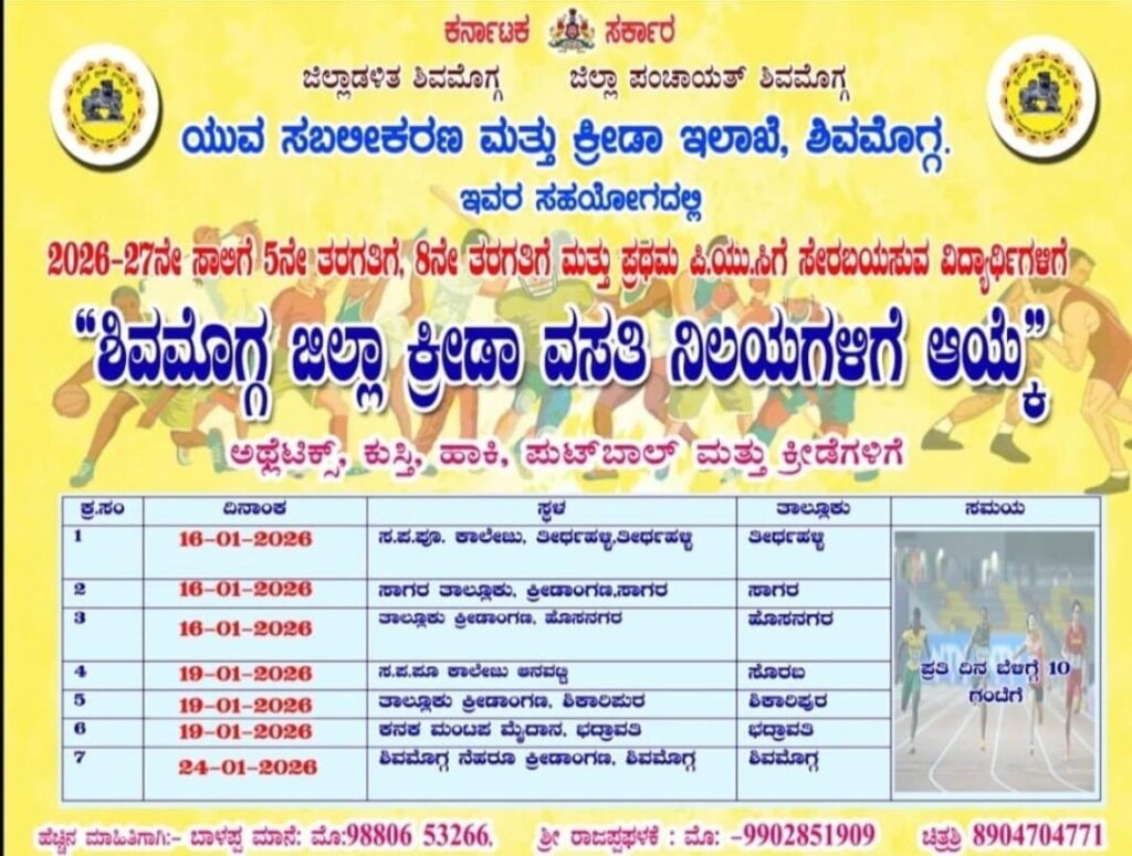 ಕರ್ನಾಟಕ ಸರ್ಕಾರದ ಯುವ ಸಬಲೀಕರಣ ಮತ್ತು ಕ್ರೀಡಾ ಇಲಾಖೆ, ಜಿಲ್ಲಾಡಳಿತ ಶಿವಮೊಗ್ಗ ಹಾಗೂ ಜಿಲ್ಲಾ ಪಂಚಾಯತ್ ಸಹಯೋಗದಲ್ಲಿ 2026–27ನೇ ಸಾಲಿಗೆ ಶಿವಮೊಗ್ಗ ಜಿಲ್ಲಾ ಕ್ರೀಡಾ ವಸತಿ ನಿಲಯಗಳಿಗೆ ವಿದ್ಯಾರ್ಥಿಗಳ ಆಯ್ಕೆ ಪ್ರಕ್ರಿಯೆ ಆರಂಭವಾಗಿದೆ.